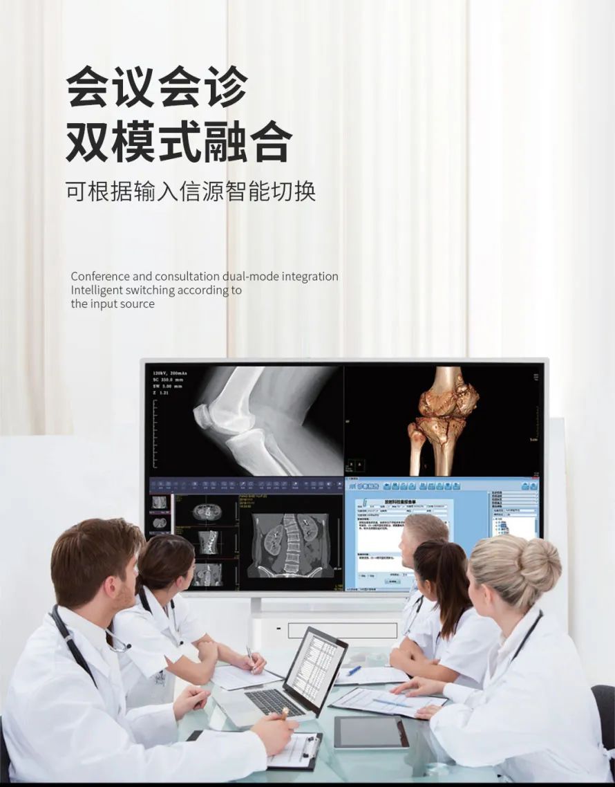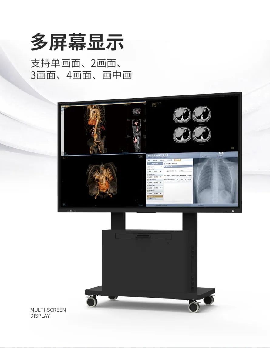 高分辨率 本诊断显示器具备超高的4K分辨率,86寸的屏幕显示800万像素(3840X2160)的信息,适合20-30人观看。 超高亮度 显示器原生面板具备500cd/m2 的UHD超高亮度,正常室内光线不影响效果。符合DICOM图像诊断的要求。 实时DICOM动态校正系统 本显示器在出厂前进行全屏幕测量并校准,以便符合严格的DICOM曲线标准,另外在出厂后的使用过程中,通过背光传感器进行实时屏幕中心位置亮度测量,把实时显示的亮度值反馈给内置的校准系统,从而实现液晶面板显示亮度的校正,保证全屏幕符合DICOM标准的长期性、一致性。屏幕中心位置亮度更接近日常观看区域的亮度。 仙艺通过精密的色彩算法,可以对显示器的亮度和对比度、色温根据偏好进行任意调节。比起传统的固定LUT表技术更加先进、便利。 高灰阶度、色彩深度 显示器具备48BIT(R\G\B)查找表,从281.5亿色彩里挑选最佳的10.7亿种颜色,显示平滑准确的DICOM图像。 全屏幕亮度、色度均匀性校正 原生的液晶面板由于液晶技术的限制会出现亮度、色温不均匀的现象,专色下不均匀性现象明显,为了克服这个现象,在出厂前会通过屏幕均匀性系统对全屏幕进行亮度、色度补偿修正,保证DICOM图像准确,观看效果更佳舒适。 一体化多屏无缝查看图像\OPS兼容性扩展 X861具多种输入信号接口,具备单画面/2画面/3画面/4画面/画中画功能,多窗口画面伽玛独立调节、分辨率自动调整。具备最新的TYPE-C,HDMI x3,DisplayPort,DVI等接口 交互式触摸系统 仙艺智能影像中心大屏幕具备20点交互式触摸,手指或触摸笔均可进行触摸,实高性能书写软件,支持单点、多点书写,增加笔锋书写效果等,任无线同屏,支持多路同屏,实现镜像反控、远程快照、文档共享、无线发言、无线遥控器等。